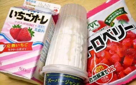 アレンジに使ったのは、こちらの3つ。いちごオレとソフトクリーム型アイス、冷凍ストロベリーだ。