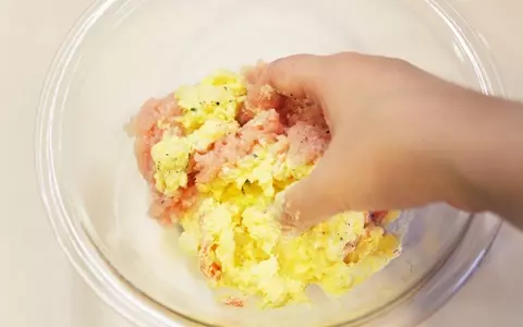 1.まず、ポテトサラダ、挽肉、塩胡椒をボールに入れて、よく練り混ぜます。