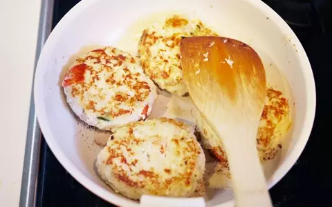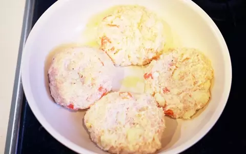 2.4等分にして丸く整形し、油をひいたフライパンに並べます。(整形しにくい場合は、手を一度洗い、油か水を付けるとやりやすくなります)
