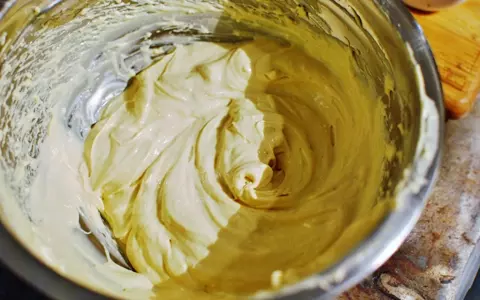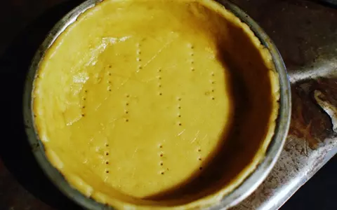2. 台に出して一まとめにし、上下ラップではさんで3mmほどの厚さに、麺棒で伸ばす。型の内側に油かバターを塗り、伸ばした生地をぴっちりと敷き詰める。余った生地は切り取り、底にフォークで何箇所か空気穴をあける。180度に予熱したオーブンで15分焼く。焼けたら取り出して冷ましておく。