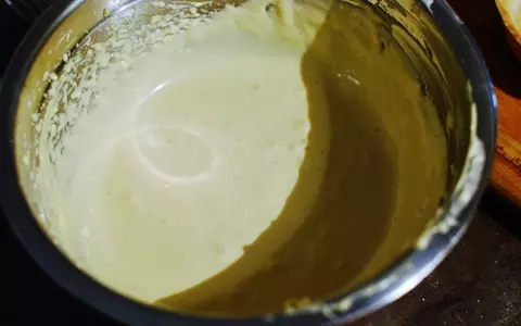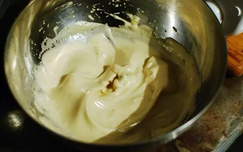 6. 4に5を入れてハンドミキサーの低速で混ぜ合わせる。さらに3を湯せんにかけて溶かしたものを加えてしっかり混ぜ合わせる。