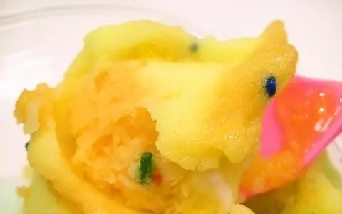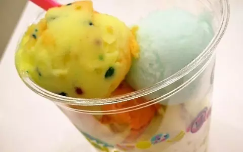 まず1つめは「キャンディボックス」。レモン&パイナップルとオレンジ&マンゴーの2種類のソルベに青・赤・黄色・緑・オレンジの5色のポップロックキャンディーが入っている。4種の果物のフルーティーなおいしさがぎゅっとつまったソルベにキャンディの甘さとカリカリとした食感が楽しい、見た目にも楽しいフレーバーだ。