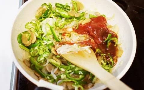 5.玉葱が色付いてきたら、ピーマン、マッシュルーム、ケチャップ、ソース、味噌、塩を加えて炒めます。
