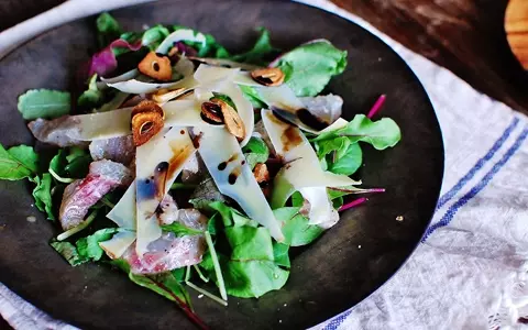 4.コンテチーズをピーラーで薄切りにして全体にのせる。揚げたにんにくを全体に砕いて飾り、さらに半量になるまで煮詰めたバルサミコをまわしかける。仕上げにEVオリーブオイル(分量外)を少々まわしかけ、黒胡椒をふって完成!
