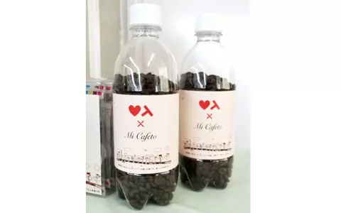コーヒー豆が入れられているのは、ペットボトル。豆には香り成分の炭酸ガスが含まれており、それを密封するための工夫だという。蓋を開けると炭酸飲料のような、ガスが抜ける音がしてコーヒーの香りが広がりました。豆を挽き、フィルターに入れ、お湯を注ぎます。