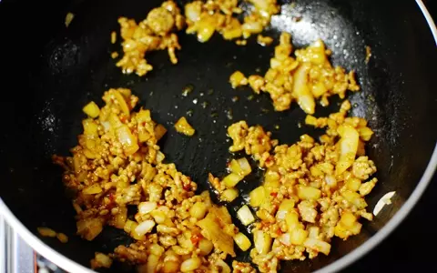 2. 肉の色が変わってきたら◎を入れて、水分がなくなるまで炒める。煮詰まったら取り出して冷ましておく。