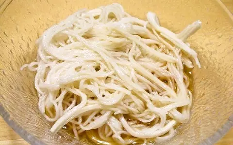 まず、普通にそうめんを茹でて、器に盛り付け、麺つゆを適量入れる。
