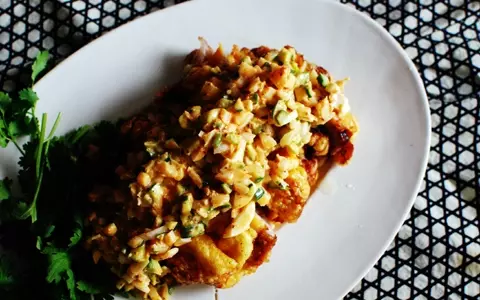 5.しっかり油を切って、食べやすい幅に切る。器に盛って上に3のタルタルをかけて完成!