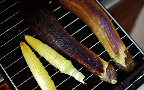 1. ベビーコーンは皮を剥く。茄子と一緒にグリルで焼く。ナスは皮が真っ黒になるまで焼く。(ベビーコーンは焦げないように、途中で取り出す)