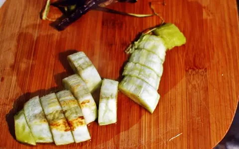 2. 皮が真っ黒になったナスは、皮を剥き、適当な大きさに切る。(熱いのでやけどに注意)