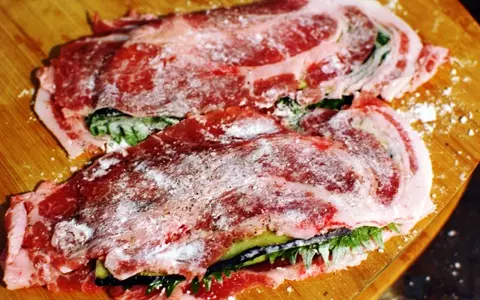 1. 豚肉をひろげ、塩、胡椒少々で下味をつける。