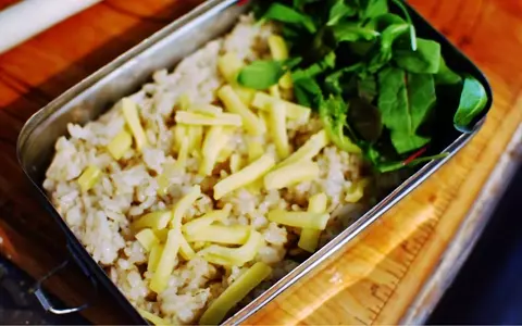 6. 弁当箱にご飯をしきつめ、横にベビーリーフをたっぷり添える。ごはんの上にシュレッドチーズを散らばるようにのせる。