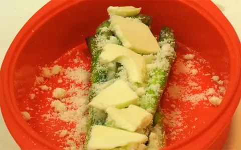 2. シリコンスチーマーにアスパラを入れ、Aをのせて、水をふって蓋をし、電子レンジ(600W)で2分30秒加熱する。
