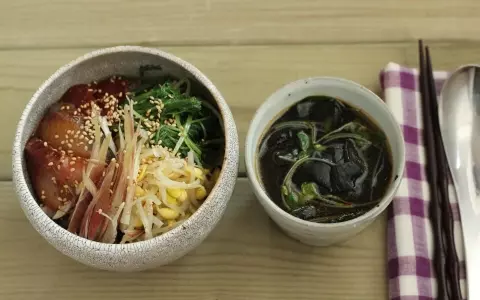 刺身をたれに漬けている間にもう1品、わかめスープも作りましょう。それではさっそく「韓国風ピリ辛漬け丼」の作り方です。