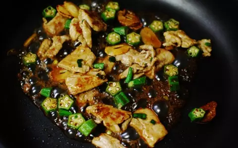 2. 豚肉に半分くらい火が通ったらオクラを入れてさらに炒め、◎を入れて煮詰めるように絡ませる。