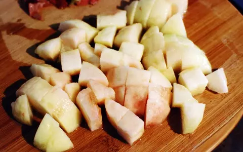 1. 桃は皮を剥き、種をはずして1.5cm角くらいの大きさに切る。