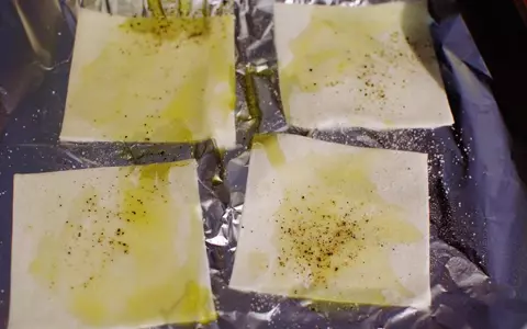 3. アルミホイルの上にワンタンの皮を並べ、オリーブオイルを表面に薄く塗る。その上に黒胡椒をふっておく。