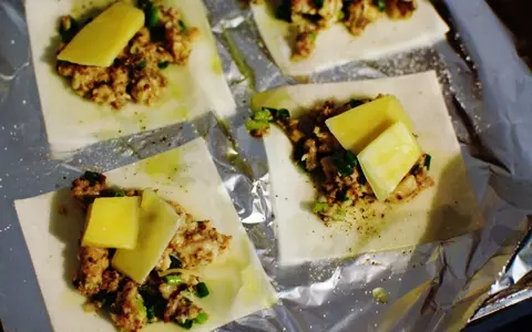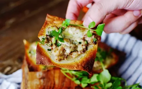 4. 3のワンタンの皮の上に2をのせ、チーズをのせて200度くらいのトースターで5~6分焼く。※焦げやすいので注意! 様子を見ながら焼こう