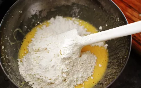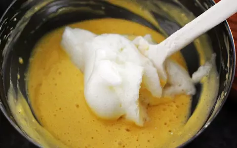 4. ゴムベラに持ち替え3のメレンゲを数回に分けて入れながら、均一に混ざるように混ぜる。空気をつぶさないようにふんわり底から混ぜる。