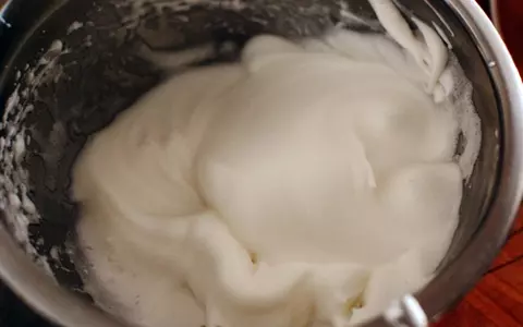 3. 別のボウルで★を泡立てて、角がゆっくりおじぎするくらいのメレンゲを作る。(あわ立て過ぎに注意。硬さの様子をこまめにチェックしながら泡立てよう)