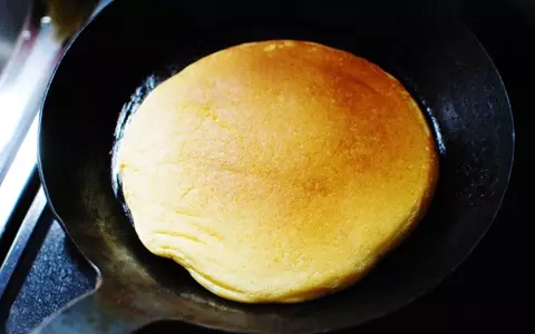 再びコンロに戻し、ごく弱火にかける。4の生地をお玉1杯半ほど丸く広げ、ふつふつと穴が開いてくるまで焼く。ちょっと裏側をめくってみて、良い色になっていたら、ヘラでひっくり返し更に焼く。
