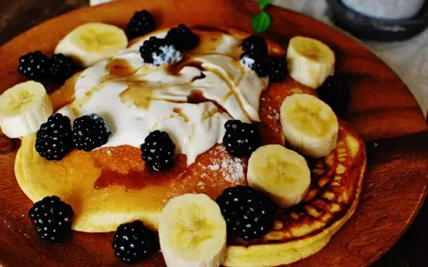 6.皿に盛り、お好みで粉砂糖を茶漉しでふるってかけたり、生クリームやヨーグルトソース、メープルシロップなどをかけ、フルーツを飾って完成!