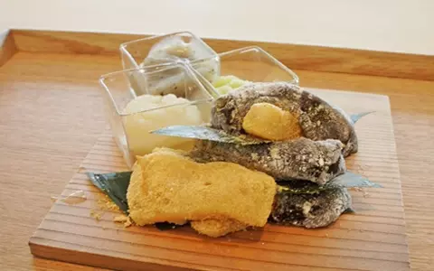 甘いものは別腹ですから、三色餡と本わらび餅もお願いしました。ゆかり、ずんだ、レモン餡をわらび餅につけていただきます。本物の蕨粉から作られた餅は弾力がありとてもおいしい。レモン餡は、酸味が夏にぴったりでした。