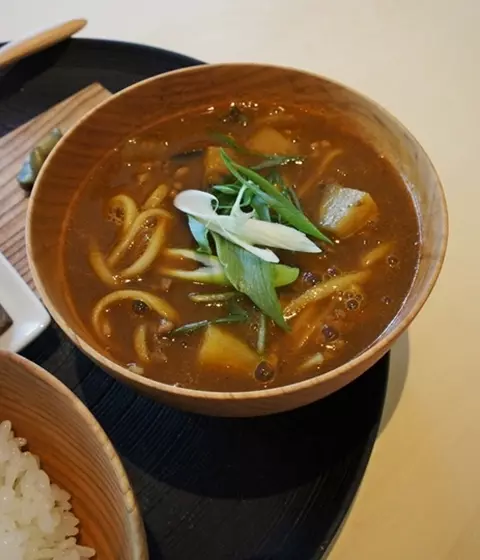 ネーミングが楽しい女将さんのカレー饂飩は、茄子、ひき肉、じゃがいも、九条葱入り。家庭的な味でペロッと食べてしまいました。料理全般に使われている椀や盆は桜やメイプルで手に馴染み、洒落ています。
