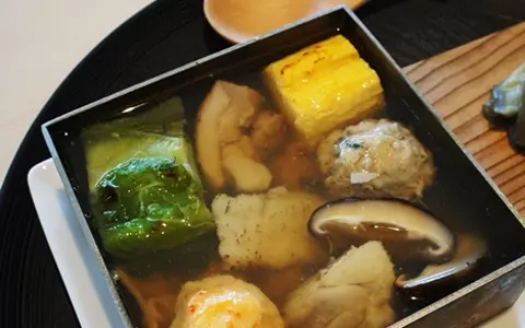 メインには、一番人気だという月替わりの、文月 寄せ鍋ご飯を選びました。はも、海老団子、鯛あら、巻玉子、浅利、大山鶏団子、白菜、しいたけ、各素材からでた出汁がおいしいです。