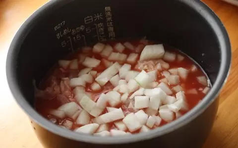米2合を洗い入れ、トマトダイス缶2分の1缶を入れたら規定の線まで水を入れます。小さく切った鶏もも肉と、角切りにした玉ねぎ、塩小さじ1を入れ炊飯器で炊きます。