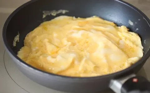 卵を加えたら菜箸でぐるぐるっと混ぜたら、縁をはしでまとめ、ほんの10秒ほどそのまま焼きます。しっかり底面を焼く事で、チキンライスの上に乗せる時に破けず、つるっと滑らせる事が出来ます。