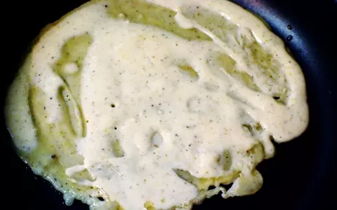 3.フライパンにごま油を入れて熱し、2を流しいれ、手早く薄く丸く広げる。ここで弱めの中火にする。