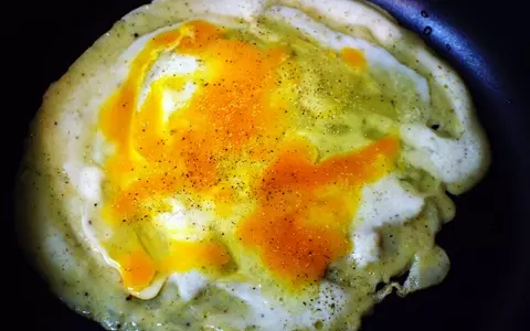 4.上に卵を割りいれ、黄身をつぶして全体に広げる。ここに塩、胡椒を少々ふる。