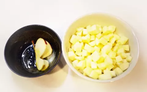 5.その他のリンゴは皮を剥いて食べやすい大きさにざく切りにします。変色を防ぐため、レモン汁をまんべんなくかけてまとわせます。飾り切りはその後冷蔵庫で冷やしておきます。食コラム記事ランキング