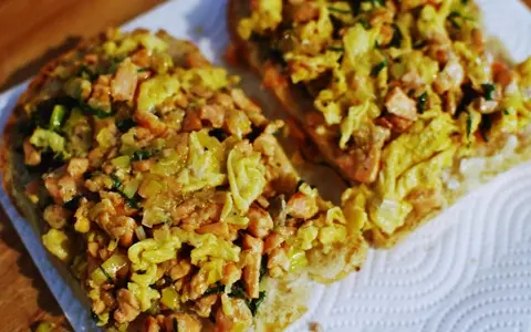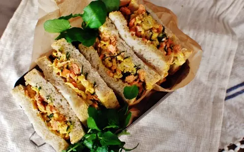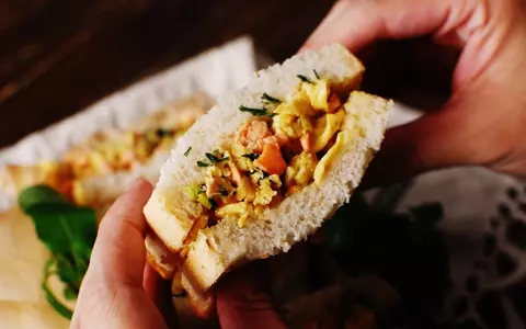 柚子胡椒の風味が香る、大人の鮭のサンドイッチ。スクランブルエッグは火を通し過ぎないようにトロトロに仕上げるのがポイント! サンドイッチの具のほかに、ごはんにのっけても美味しいです。