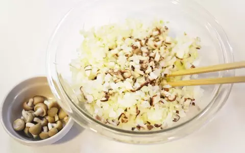 1.では早速作ってみましょう。まず、使用するきのこはお好みのものでOKです。(ちなみに今回は椎茸5個とシメジ半パックの合計100gを使用。)玉葱ときのこは細かいみじん切りにして大きめの耐熱ボールに入れます。飾り付けにきのこを使いたいので、傘の部分を取り置きしておきます。