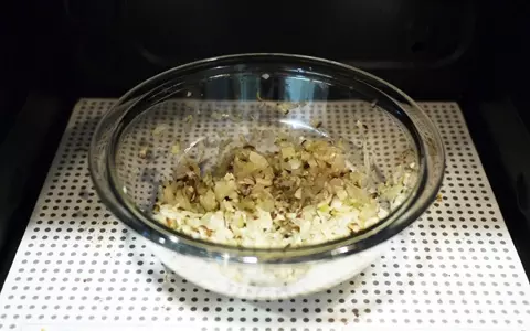2.電子レンジでみじん切りにした具材を加熱します。ラップをせずに500wで2分加熱します。加熱後はその都度取り出して混ぜるようにして、これをあと3回程度繰り返します。水分が飛んで、全体的に火が通ったらOK。