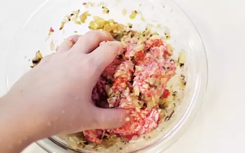 3.粗熱がとれたら挽肉と全ての調味料を加えてよく練り混ぜます。混ぜ終わったら、冷蔵庫に移して種を少し休ませます。