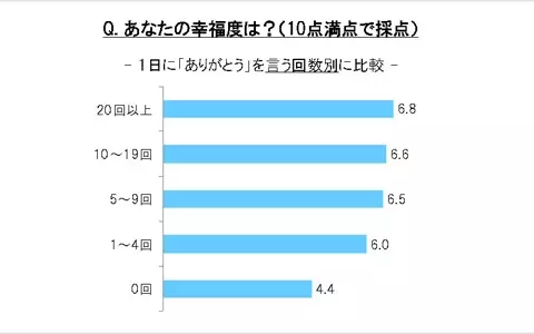 加えて、1日に「ありがとう」を20 回以上言う人の幸福度(平均6.8点)は、全く言わない人(平均4.4点)の1.5倍で、「ありがとう」の効果は一目瞭然のよう。「ありがとう」は言われる人だけではなく、言う人も幸せにするのですね。