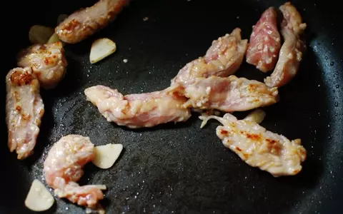 3.鶏せせりに火が通ってきたら白ネギの白い部分を入れ、焼き色をつけるように炒めたら酒を回しいれる。