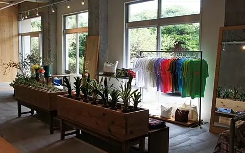店内は高い天井に庭が見えるたくさんの窓が開放的で、海の暮らしに似合いそうなバッグ、サンダル、着心地が良さそうな服が並んでいました。