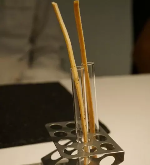 試験管に入れられた細長い物体は、オーブンから出てきたアツアツの状態。スパークリングが進む、スターターにふさわしいスナック。この食材の正体を知ったら驚くに違いない。