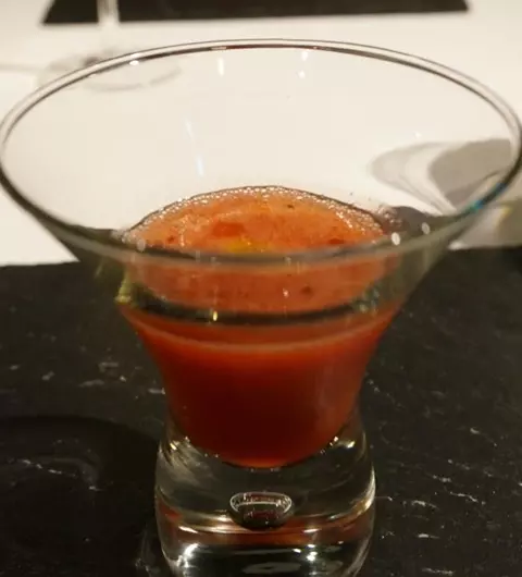 トマトのカクテルと命名され、温冷それぞれの温度の違いを楽しめる。 温度が変化しないように急ぎながらも、隠れた食材を見つけるべく、慌てずに味わいたい。