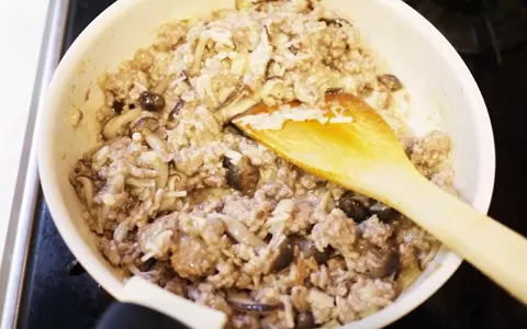 6.蓋をとり、塩と分量外の水(200cc)、米粉を加えてよく混ぜます。中弱火で混ぜながら加熱して、とろみがついたらソースの完成。(※ソースの塩加減は好みですが、後でスパイスやレモン汁を加える場合、少なめでも美味しくいただけます)