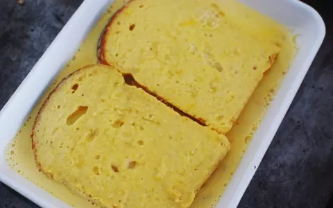 1.バットに★を入れよく混ぜ、食パンを浸す。5分たったら裏返して、両面にしっかり卵液をしみこませる。