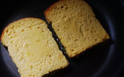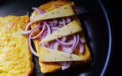 4.焼き色がついたら裏返し、1枚のパンに玉ねぎ、チーズをのせる。