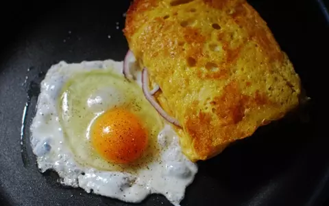 5.すぐに、もう1枚のパンの焼き目がついたほうを内側にしてのせる。ぎゅっと抑えて焼き、1分ほどしたら2枚重ねた状態で裏返す。空いたスペースで目玉焼きを作る。