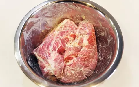 1.お肉が長い場合は半分に切り、肉の表面を包丁の先でまんべんなく刺しておきます。ニンニク、ヨーグルト、塩(大さじ1杯)、胡椒適量を揉み込みます。一晩冷蔵庫で寝かせて味を馴染ませます。