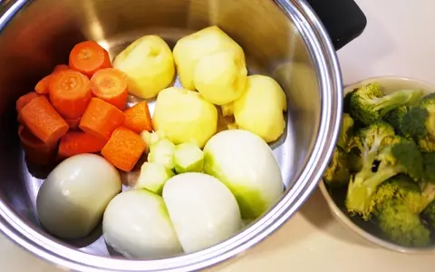 2.野菜は皮をむいて、かなり大きめに切っておきます。小さいものはそのままでもOK。今回、青野菜はブロッコリーを使用していますが、キャベツなどでもOKです。ブロッコリーは火が通りにくい芯の部分だけを先に入れます。茎の外側は固い繊維があるので、周囲を厚めにそぎ落としてから食べやすい長さに切って入れます。