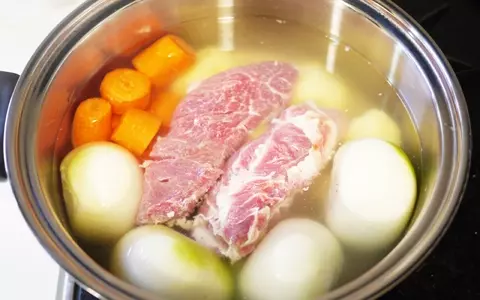 3.野菜の入った鍋に水(1.5L)、酒を入れます。お肉はさっと水で洗ってから入れ、火にかけます。